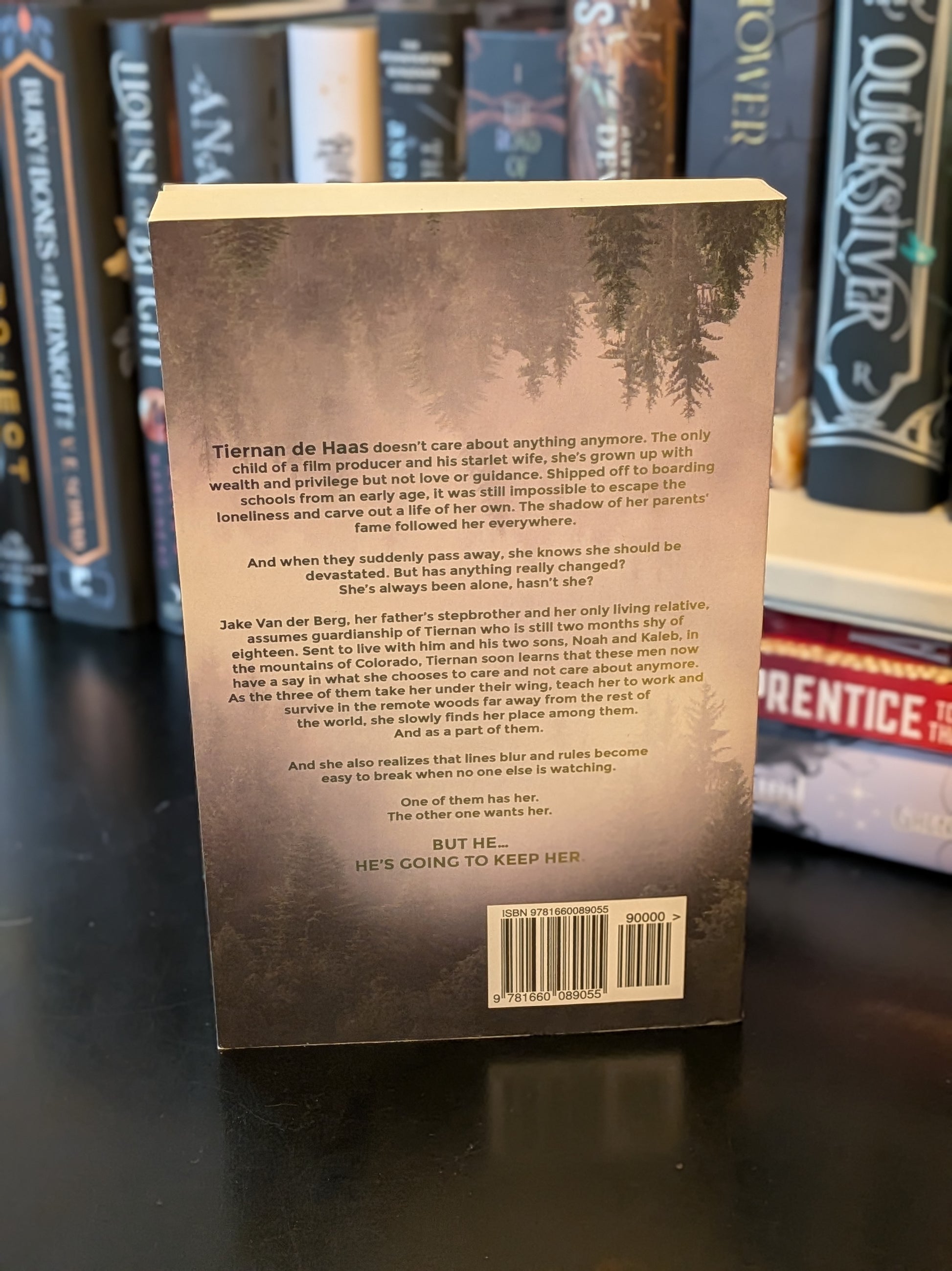 Jake Van der Berg, her father’s stepbrother and her only living relative, assumes guardianship of Tiernan who is still two months shy of eighteen. Sent to live with him and his two sons, Noah and Kaleb, in the mountains of Colorado, Tiernan soon learns that these men now have a say in what she chooses to care and not care about anymore. As the three of them take her under their wing, teach her to work and survive in the remote woods far away from the rest of the world, she slowly finds her place among them.